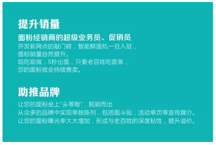 智能鮮面機可以成為糧油經銷商伙伴們開發新網點的敲門磚,智能鮮面機入駐了,面粉銷售自然就提升了。